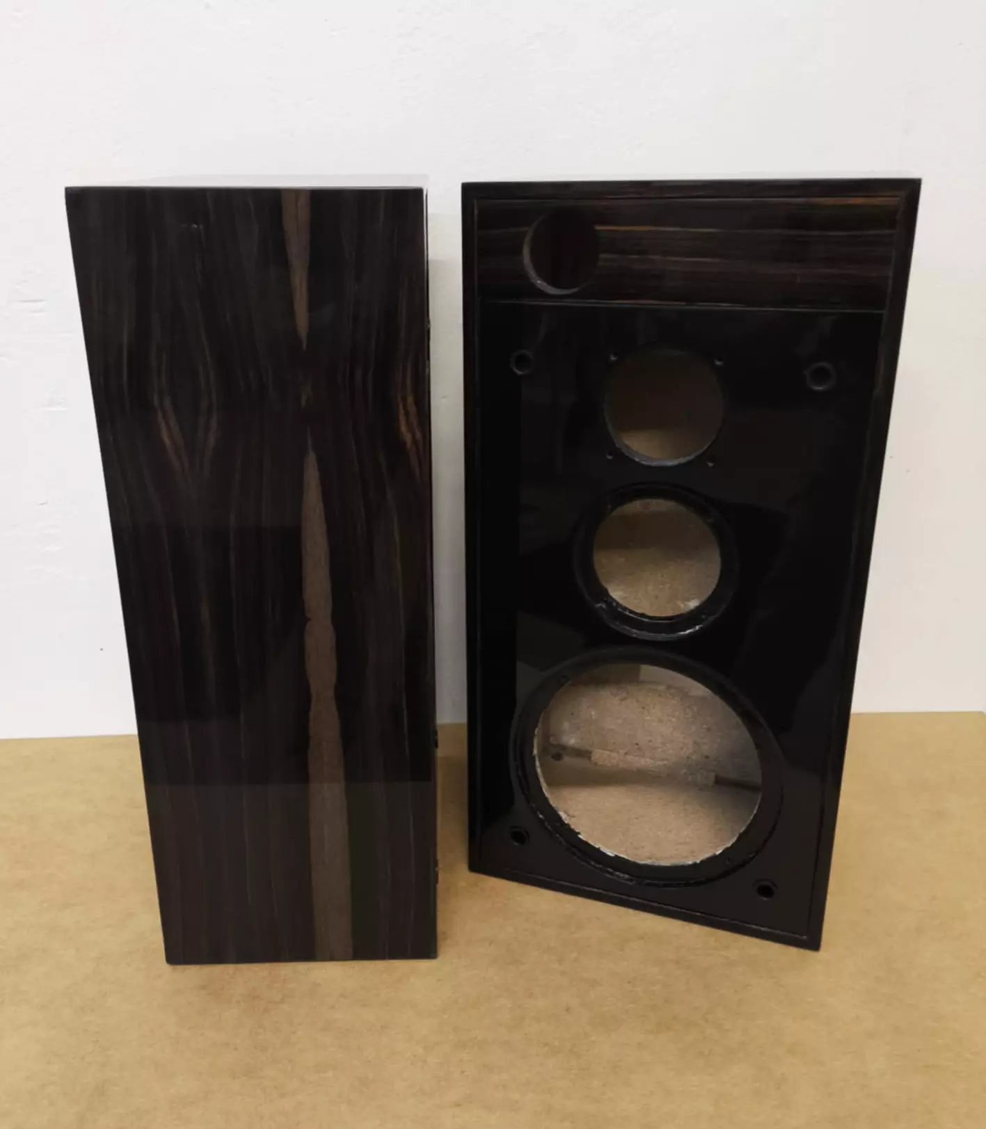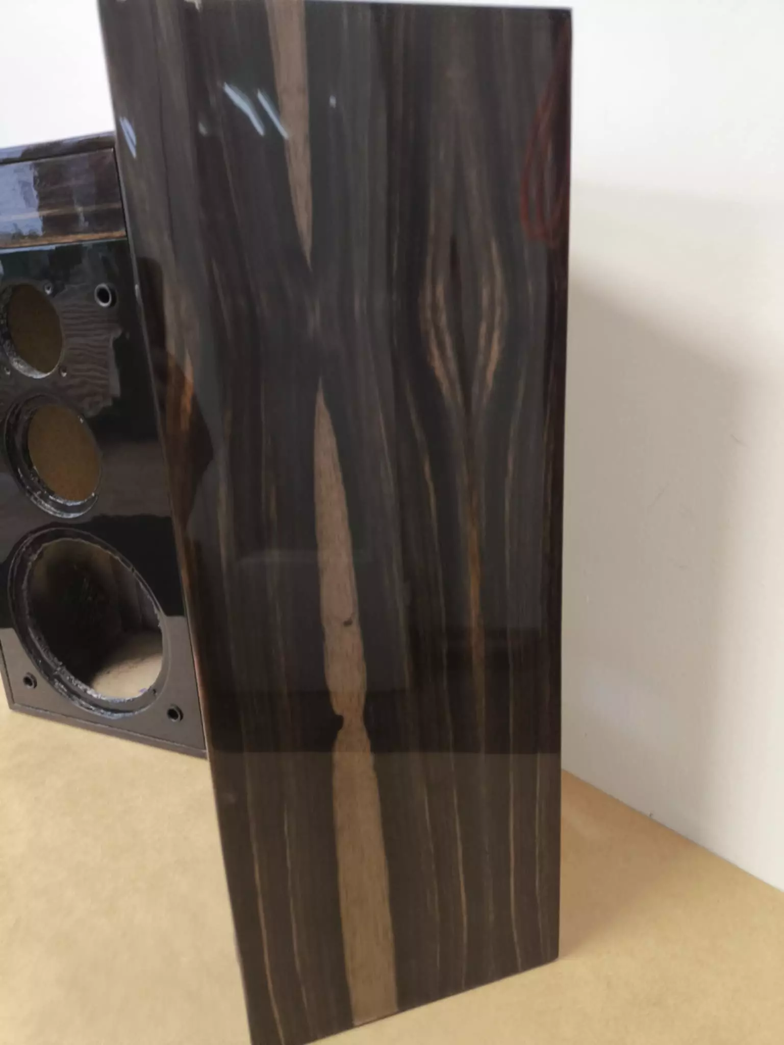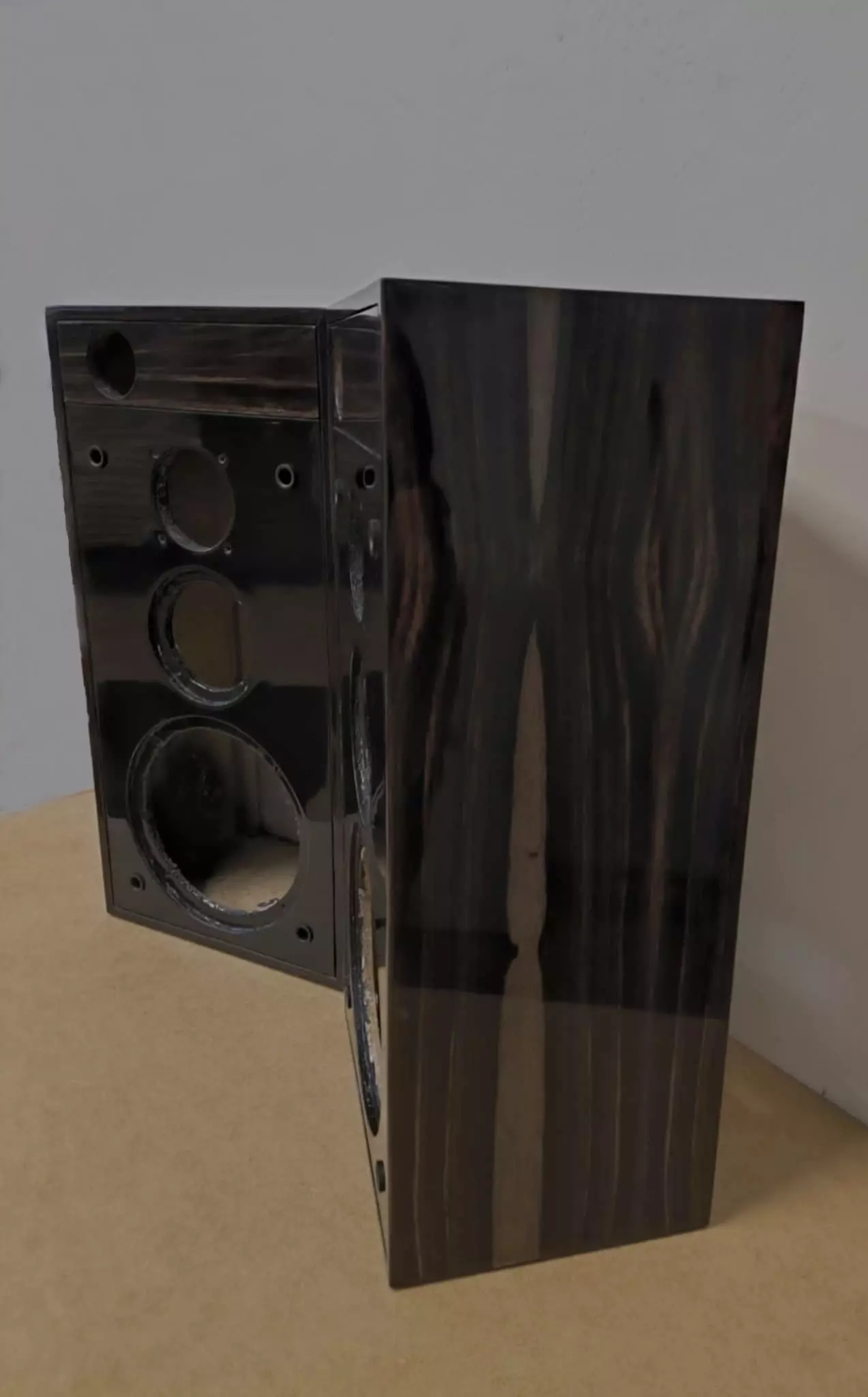 Do fornirowania wybrałam heban. To drewno wymagające – zarówno w obróbce, jak i w decyzji, czy w ogóle po nie sięgnąć. Heban nie wybacza niedokładności, ale w zamian oferuje głębię koloru i elegancję, której nie da się podrobić. Jego naturalna ciemność i wyraźny rysunek słojów idealnie wpisały się w charakter obudów, podkreślając ich bryłę zamiast ją dominować.