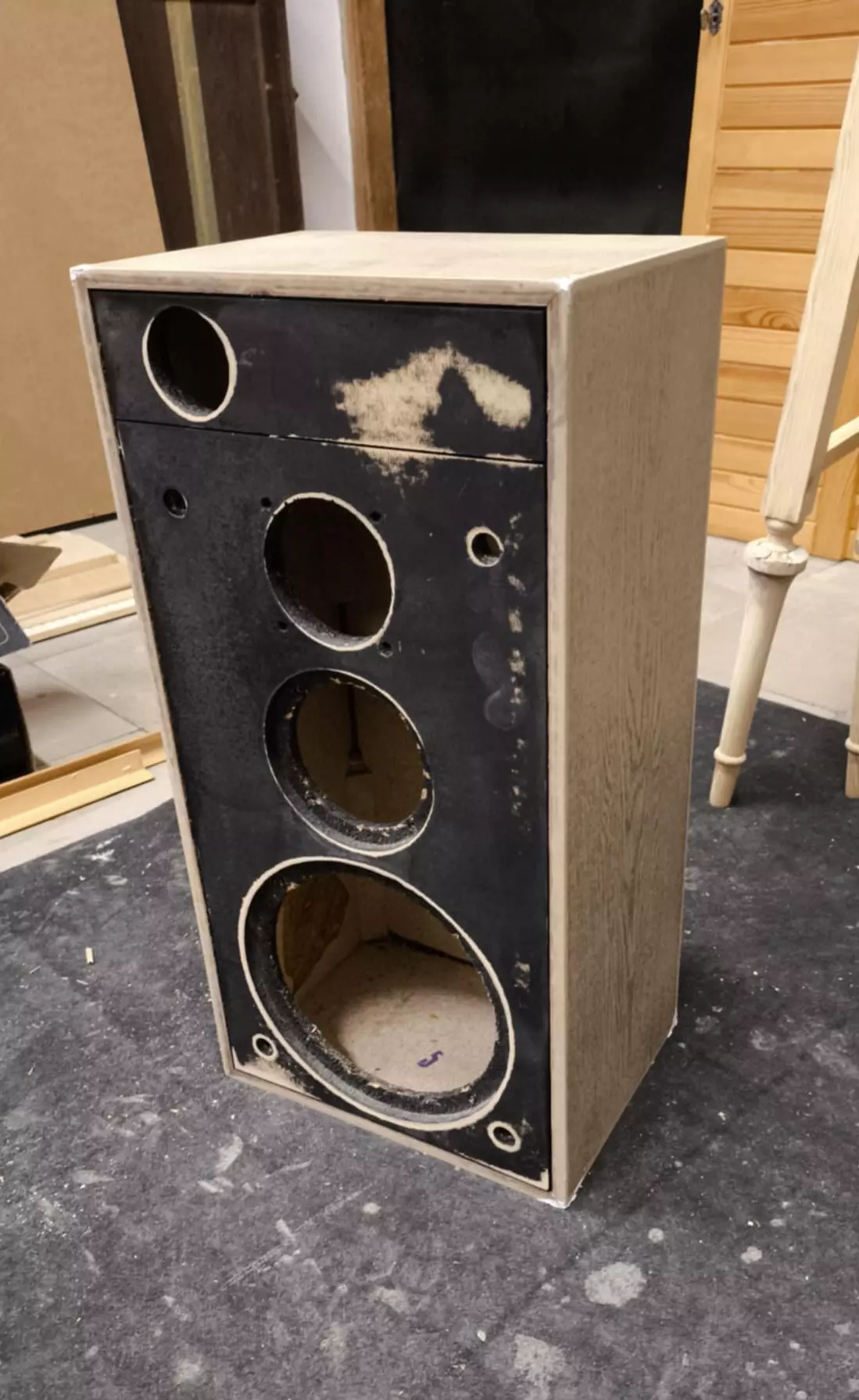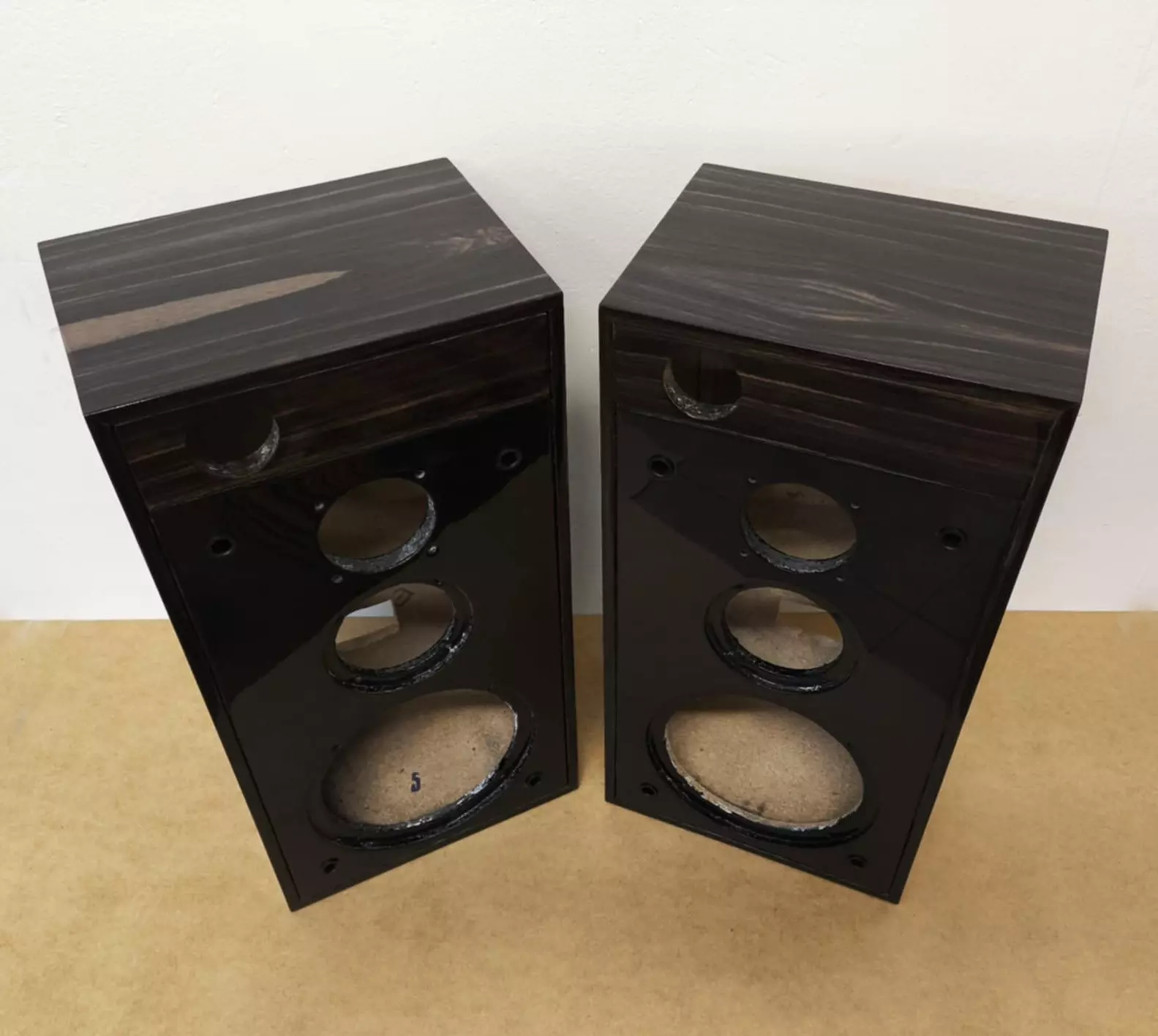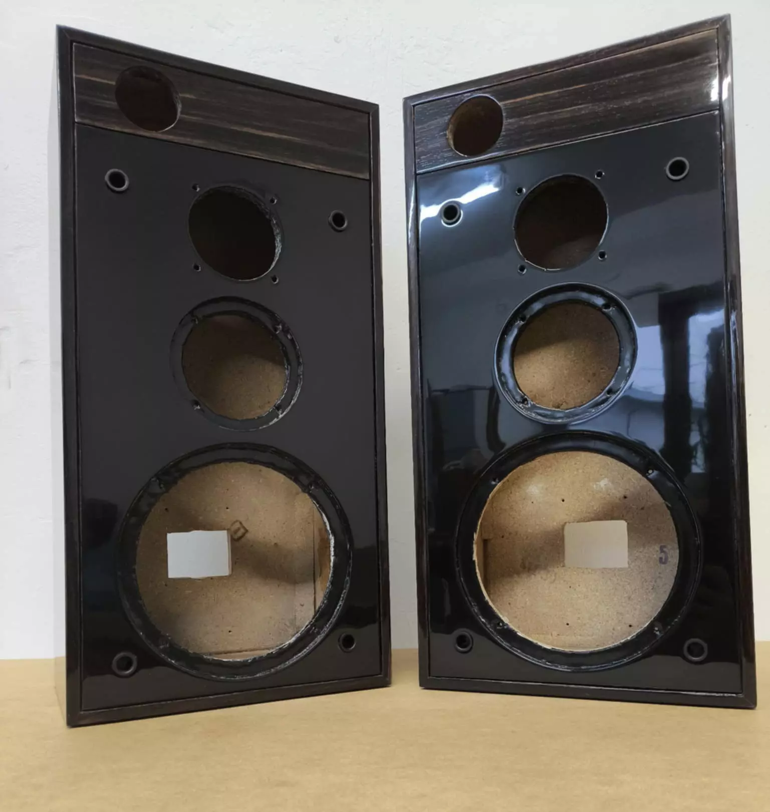 Do pracowni trafiły obudowy, których stan wizualny nie odpowiadał ani jakości wykonania, ani potencjałowi samej formy. Konstrukcyjnie zachowane, z czytelną bryłą i poprawnymi proporcjami, wymagały jednak pełnej ingerencji w warstwę wykończeniową. Celem renowacji było przywrócenie im estetycznej spójności oraz nadanie wyraźnie bardziej szlachetnego charakteru, bez ingerencji w ich pierwotną funkcję.