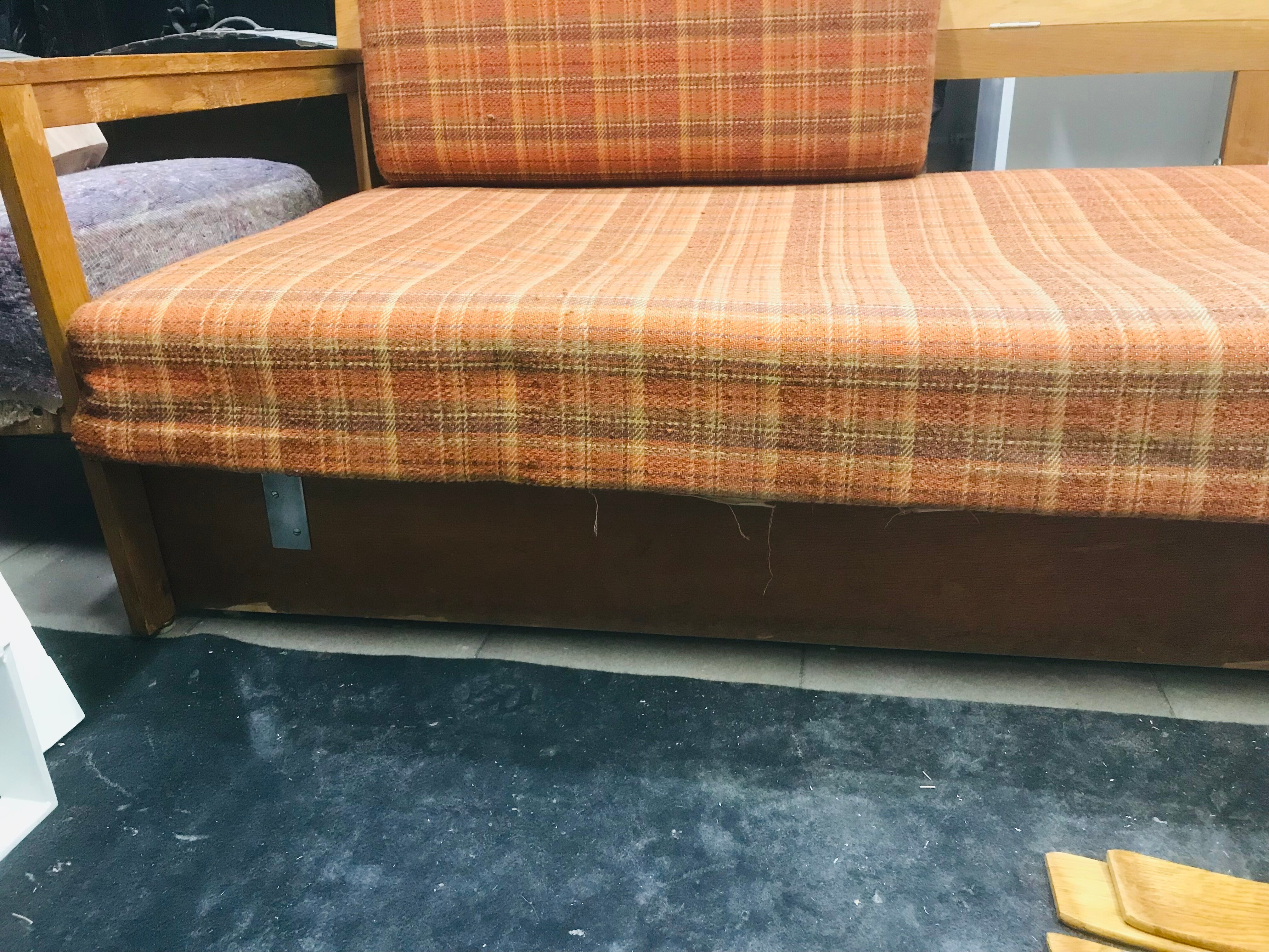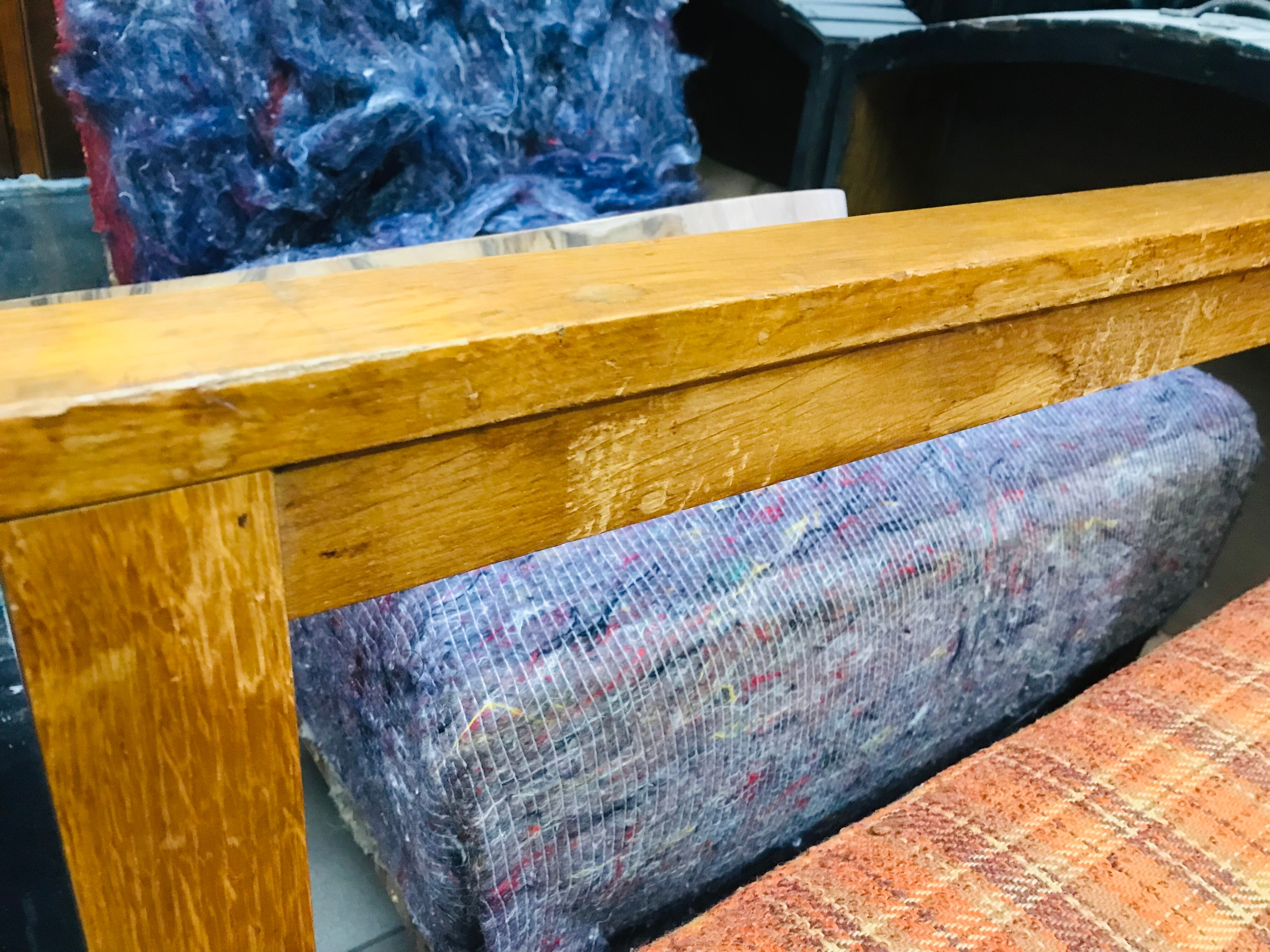 Mebel trafił do pracowni w stanie typowym dla obiektów intensywnie użytkowanych przez wiele lat. Widoczne były zużycia tapicerki, osłabienie komfortu siedzenia wynikające z degradacji wypełnień oraz ślady eksploatacji na elementach drewnianych. Konstrukcja zachowała jednak stabilność i nie wymagała ingerencji stolarskiej.